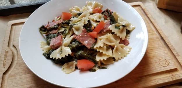 For this recipe, you can use whatever pasta you like. I chose farfalle and instead of regular bacon I opted for turkey bacon and spinach. I have to say YUMMMMAROOO!!! Best part is this is just another recipe that is quick and easy to make and can be eaten warm or cold as I found out when I got hungry later in the evening!