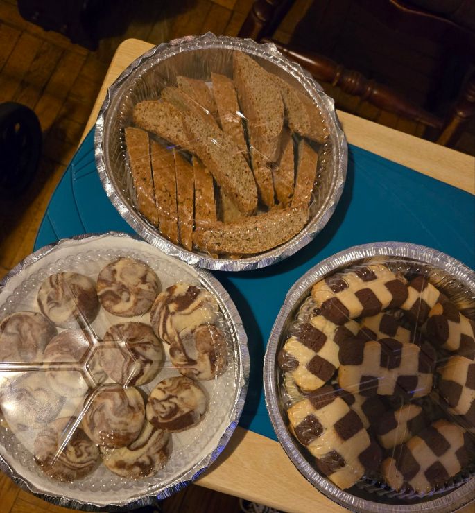 Saturday I spent all day making biscotti, buttery sable cookies, then vanilla and chocolate sables to make checkerboard cookies. While I was not able to make it to my friend’s house on Sunday, I did send her a cookie tin filled with the goodies I made.